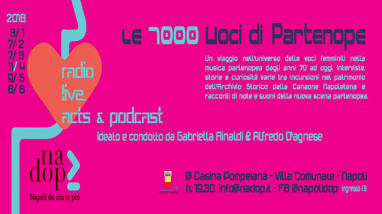 2018 – NA≥DOP – Napolidaorainpoi presenta  Le 1000 Voci di Partenope: un viaggio nell’universo della vocalità al femminile nella musica partenopea dagli anni 70 ai giorni nostri.